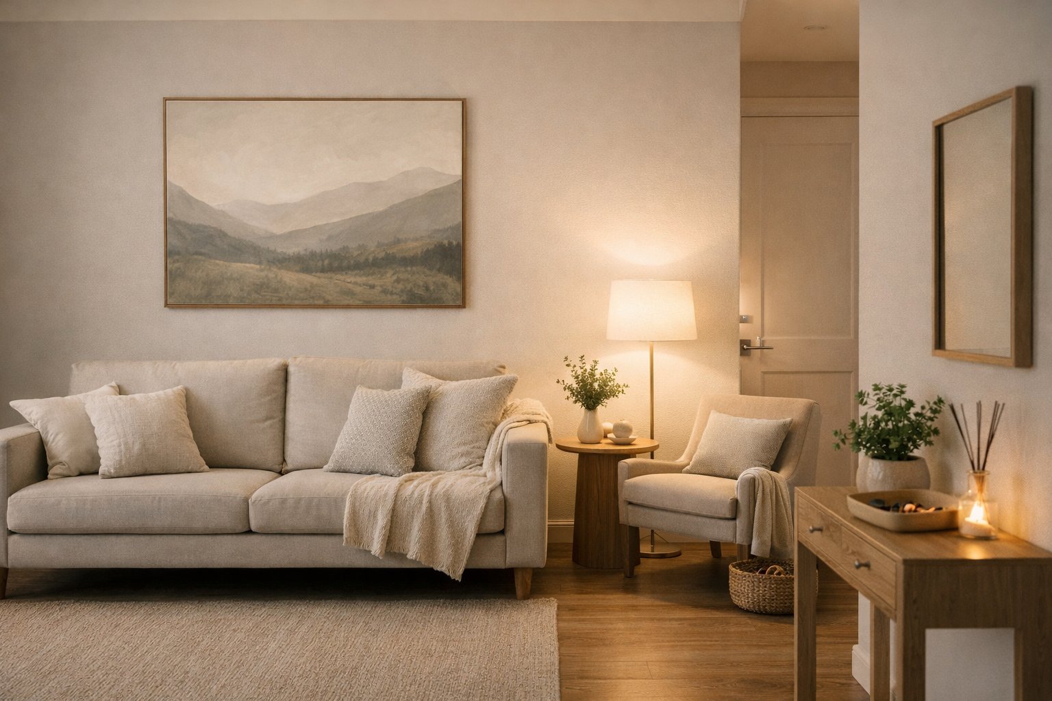- 重點:畫不要掛太高,讓畫的中心點約在你的視線平視高度(約 145-150cm)。這樣你的沙發區瞬間就會變成藝廊一角。